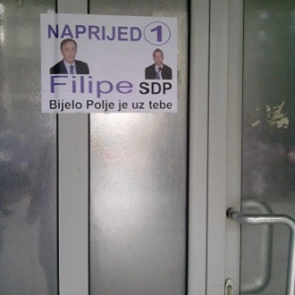 Naime, pojavili su se plakati Andrije Mandića koji u ruci drži masku sa likom Miodraga Lekića, dok je sa druge strane, grad bio oblijepljen i plakatima na kojima je uz fotografiju nezavisnog kandidata Lekića, bila fotografija i predsjednika OO SDP Tufika Bojadžića, na kojima je pisalo "Naprijed 1 Filipe SDP Bijelo Polje je uz tebe"
